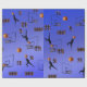 em um fundo de gradiente azul estão jogadores de basquete, arcos, bolas, números, logotipos, em um padrão colorido de basquete