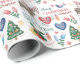 Este papel de embrulho de Feriado bonito é coberto por imagens de estilo escandinavo, incluindo uma rena, corações de padrão, uma árvore de Feriado, flores, flocos de neve e muito mais. As cores incluem vermelho, verde, ouro, azul e marrom. Tudo é colocado sobre um fundo branco. O texto estilizado diz "Feliz Natal" e "Feliz ano novo". Única e festiva!