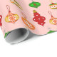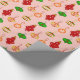 Papel de enrolamento num padrão antigo de enfeites de árvores de Natal, em vermelho profundo, verde escuro, ouro macio e cor-de-rosa, contra um fundo cor-de-pêssego mole