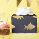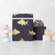 Embalagem para presentes com um padrão de peixe dourado falso com fundo preto.