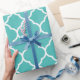 O papel de embrulho para comemoração no desenho com o design de Teal Verde do Padrão Quatrefoil.