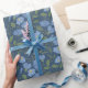 Este papel de embrulho apresenta um padrão de flores azuis periwinkle, coloridas, com folhas verdes sobre um fundo azul marinho, para um aspecto bonito e moderno.