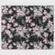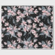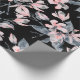 Papel de enrolamento com um padrão elegante feito com uma ilustração aquosa de flores cor-de-rosa com folhas e caules de cinza azul. Fundo preto clássico.