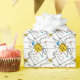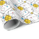 Ângulos e círculos lineares pretos em cores primárias de vermelho, amarelo e azul constituem o padrão retrorreflector contemporâneo que decora este presente, reminiscente do Meio século moderno design e da Era Atômica das décadas de 1950 e 1960.