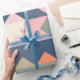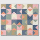 Um design gráfico colorido e divertido de triângulos e quadrados geométricos em uma paleta colorida de marinho, rosa, coral e neutrais.
