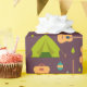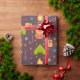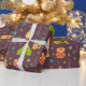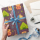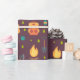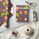 Esfregando papel com um padrão temático divertido de acampar. Colocado sobre um fundo castanho avermelhado. Elementos no padrão incluem uma fogueira, uma tenda, uma guitarra, uma pá e mochila.