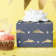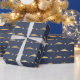 Embalagem de presente de padrão náutico azul e dourado com golfinhos em um padrão de latência.