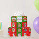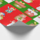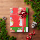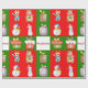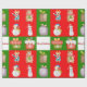 Um padrão uniforme com ilustrações mostrando imagens com um tema de Natal. As imagens são de presentes envoltos, bonecos de neve e ursos de Natal. O padrão tem nove seções com fundo vermelho e verde alternados e um branco no centro. O painel central tem as palavras Feliz Natal escrito em vermelho.