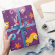 Cavalos-marinhos bonitos, pequenos e coloridos e peixes-estrelas nadando no oceano.