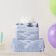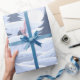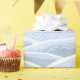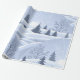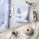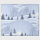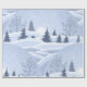 Esta paisagem de inverno mostra um lago congelado cercado por colinas e árvores cobertas de neve. A design tem um padrão circular com uma explosão de sol no céu. O esquema de cores é azul e branco.