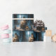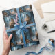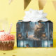 Um homem idoso vestido de forma quente senta-se num tronco numa floresta nevada com um coelho segurando um pinheiro brilhante que se assemelha a uma pequena árvore de Natal.