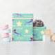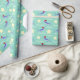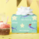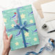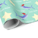 Este papel de envolvimento do divertimento caracteriza chapéus ostentando do papai noel dos peixes do espadim azul e as estrelas amarelas em um vintage denominam o fundo verde. Personalize com seu próprio texto usando o modelo. O clique personaliza-o para fazer mudanças à colocação da pia batismal e do texto.