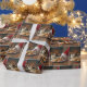 A mão enlutada de Papai Noel, vestida de vermelho, com um punho branco de pelo, alcança um biscoito adornado com aspersas coloridas de uma placa próxima a um copo de leite