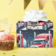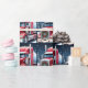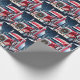 Um táxi vermelho grande com Papais noeis sendo um camionista legal, dirigindo uma grande plataforma decorada para o Natal numa noite de inverno nevada cria um papel de embrulho de férias divertido para a pessoa que dirige uma plataforma.