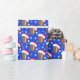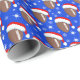 Este festivo papel de embrulho de Natal mostra futebol vestido com chapéus de Santa, rodeado por flocos de neve brancos cintilantes em um alegre fundo azul de feriado.