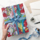Pintura colorida, branca e artística em acrílico, Papais noeis estão tocando violino na noite de inverno nevada, coruja, ornamentos florais, plantas de inverno, bagas holly em cores vermelho vivo, verde, branco, azul, amarelo. por Búlgaro Lumini (c)