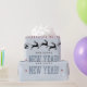 Papel de embrulho de natal festivo. Uma cinza sutil com flocos de neve. Rico com letra de tendência que diz: Feliz Natal e Feliz ano novo. Com uma silhueta preta de papais noeis cavalgando em seu trenó sendo puxado por sua rena voando pelo céu.