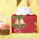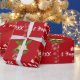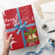 Papel de embrulho de Natal moderno, elegante e fofo, com a imagem de um monocromo puxando Papais noeis para trenó (cheio de presentes), o texto "Feliz Natal e Feliz ano novo 20XX" em escrita na moda / caligrafia e um nome personalizado. Com borrachas de flocos de neve brancos e prateados e um par de sinos Xmas ouros e uma fita vermelha, cada uma com um cintilante de holly, sobre um fundo vermelho de Natal. Certifique-se de personalizar o nome e o ano.