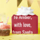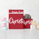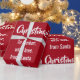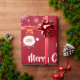 Engraçado, engraçado e elegante presente de Natal para as crianças com as palavras "Feliz Natal" na tipografia da na moda, uma dedicação personalizada que agora lê "A Amber / com amor / de Papais noeis", flocos de neve, Papais noeis em sua fantasia vermelha (segurando uma cana doce) e sua rena favorita, Rudolph, atrás dele, e uma árvore de Natal. Em um fundo vermelho com flocos de neve.