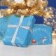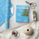 Papel elegante e fofo embrulhado no Natal, com Papais noeis na trenó puxados por um unicórnio, vários flocos de neve, e árvores de Natal decoradas com bolas prateadas. Perfeito para crianças pequenas, especialmente meninas que gostam de unicórnios. Com a saudação "Feliz Natal / Emma!" em escrita cursiva / caligrafia. Certifique-se de personalizar o nome. Sobre um fundo azul.
