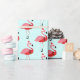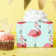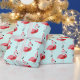 Papel de embrulho de Natal novinho com um padrão de flamingos cor-de-rosa em roupas de Papai noel sobre fundo azul.