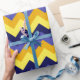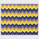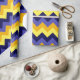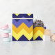 Um rolo de papel de embrulho que apresenta um design de chevrons de forma doce e ombre em azul, amarelo e ouro.