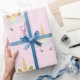 Embalagem de presente de Unicórnio com rostos de unicórnio adoráveis em um fundo rosa.
