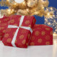 Este papel de embrulho com flocos de neve dourados e fundo vermelho brilhante é excelente para fazer seus presentes de Natal parecerem especiais. A cor de fundo pode ser alterada.