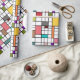 Este papel de embrulho tem um design moderno do século médio de uma grade de linhas pretas com quadrados e retângulos em cores retrorativas em um campo de branco.