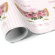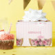 Papel de embrulho de menina doce feito em listras cor-de-rosa e brancas, com gráficos de um rosto de gatinho bonito, com lascas oculares de ouro e uma coroa rosa e flores cor-de-rosa. Personalize o nome para aniversários e muito mais.
