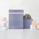Um papel de envolvimento projetou com um teste padrão do guingão dos azuis marinhos e do branco no tamanho pequeno.