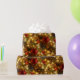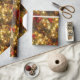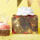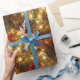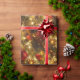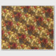 Papel brilhante de embrulho de Natal com bolhas de Natal vermelhas e ouros, luzes cintilantes, galhos de galinha e ramos de árvores de Natal