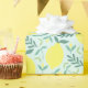 Padrão botânico de limão com uma coleção de limões amarelos claros, folhas compostas de alfarroba em queda, cápsulas de sementes e rebentos em chartreuse verde-patina, verde-azul e verde-esverdeado. Colocado sobre um ciano muito insaturado e muito leve.