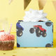 Papel de embrulho de aniversário de caminhões monstros para um caminhão vermelho e azul sobre um fundo azul-céu. Localizar designs semelhantes em outros itens de aniversário em www.zazzle.co.uk/special_stationery