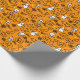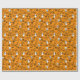 Papel embrulhando com um moderno design minimalista para o Halloween, um padrão de silhuetas de crânios, fantasmas, teias de sabugo, uma silhueta de gato, abóboras sobre fundo laranja.