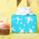 Adicione um toque divertido a presentes para esquiadores com este papel de embrulho padronizado. Ele apresenta ilustrações de esquiadores fazendo truques de esqui, assim como flocos de neve. Os gráficos brancos são colocados sobre um fundo azul brilhante.