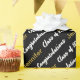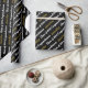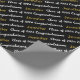 Este papel de empacotamento preto tem um modelo de texto que você pode editar. Você pode alterar o texto dourado faux (não folha) para mostrar o nome do seu formando. O texto branco mostra o ano em que o aluno se gradua (mostrado: Classe 2024) e uma mensagem personalizada (mostrada: Parabéns). Parabéns e Classe 2024 estão em um roteiro elegante, mas o nome do formando não está em um script. O texto forma um padrão de papel de embrulho de graduação.