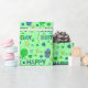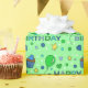 Embalagem de presente de aniversário com balões de verde limão, cupcakes azuis e bolinhas, embrulho de presente de aniversário do menino.