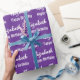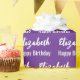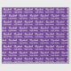 O embrulho de aniversário é roxo real. Ele tem um padrão de texto para o nome do destinatário em um script e a frase Parabéns. O nome (Mostra: Elizabeth) aparece em um roteiro elegante. O texto é branco. Todo o texto pode ser editado.