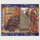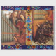 Pintura a óleo pelo pintor flamengo Jan van Eyck, The Ghent Altarpart: Angels Tocando Música e Anunciação Angel -1426-27 .Elegante, clássico, brilhante e alegre design de Natal em pergaminho com antigas motins florais florentinas e uma brilhante safira azul 3D e gemstones rubis vermelhos .