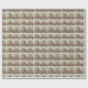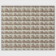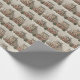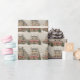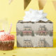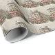 romantic Paris winter Christmas street scene illustrated in a soft painterly storybook style, elegant Haussmann buildings decorated with red garlands, wreaths, and ribbons, gently falling snow, evergreen Christmas trees with red ornaments and bows, warm glowing shopfronts with striped awnings, subtle repeating Eiffel Tower silhouettes partially obscured by snowfall, bare winter trees dusted with snow, cozy nostalgic European holiday atmosphere