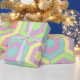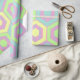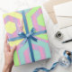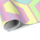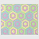 Este papel de embrulho tem um design geométrico de hexágonos em azul claro, amarelo pálido e verde pálido num campo de listras em rosa pálido e roxo pálido.