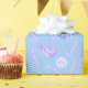 Pássaros, doces e decorações de árvores de Natal em design de arte azul e ingênua.