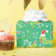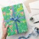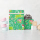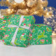 Bons pássaros cantores com cervos galinhosos saltando sobre presentes de Natal com notas musicais, neve e estrelas, papel de presente de Natal com padrão gráfico em verde-claro, vermelho-quente, branco e amarelo-verde limão.