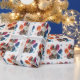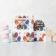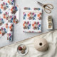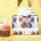 Um cão pastor australiano alegre senta-se em frente a designs coloridos de impressão de pata, mostrando uma mistura vibrante de tons vermelhos, roxos e azuis