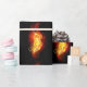 Pena de pavão brilhante feita de fogo e chamas sobre fundo negro.