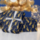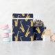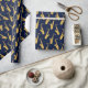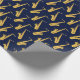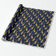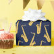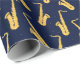 Legal papel de embrulho, padronizado com saxofones, sobre fundo azul escuro.