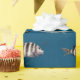 O papel de embrulho de presente para o tema da pesca. O papel azul oceânico com padrão de peixes salgados e imagens de varetas e bobinas vem em sua escolha de comprimentos. Perfeito para embrulhar presentes para o homem que vive para pescar.