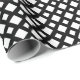 Papel de embrulho na moda apresenta um padrão geométrico de grandes e pequenos diamantes brancos sobre fundo preto. O preto forma uma trava que separa as formas de diamante. Imagem criada digitalmente. Copyright © 2014 Claire E. Skinner. Todos os direitos reservados.