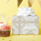 o "Anjo da Alegria" de Natal decorado com ouro metálico e pérolas brancas segurando uma placa em forma de coração pérola com o texto, "Joy" sobre uma rendas brancas BG (fundo) e emoldurada por uma estrutura em forma de quadrado de ouro. Há círculos de ouro e ornamentado entre os anjos no papel de embalagem de feriado.